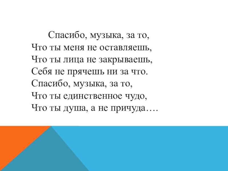 Что ты меня не оставляешь, Что ты лица не закрываешь, Себя не прячешь ни за что. Спасибо, музыка, за то, Что ты единственное чудо, Что ты душа, а не причуда….