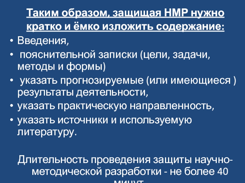 Таким образом, защищая НМР нужно кратко и ёмко изложить содержание: Введения, пояснительной записки (цели, задачи, методы и