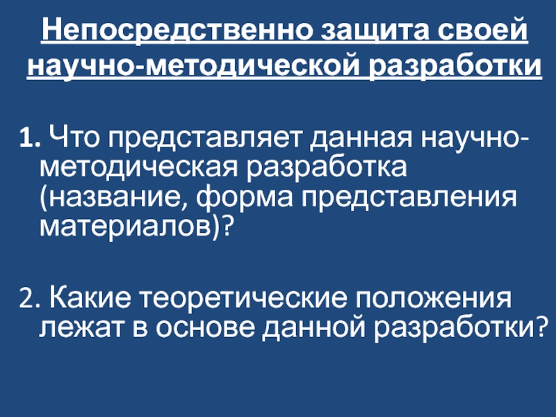 Непосредственно защита своей научно-методической разработки1. Что представляет данная научно-методическая разработка (название, форма представления материалов)?2. Какие теоретические положения