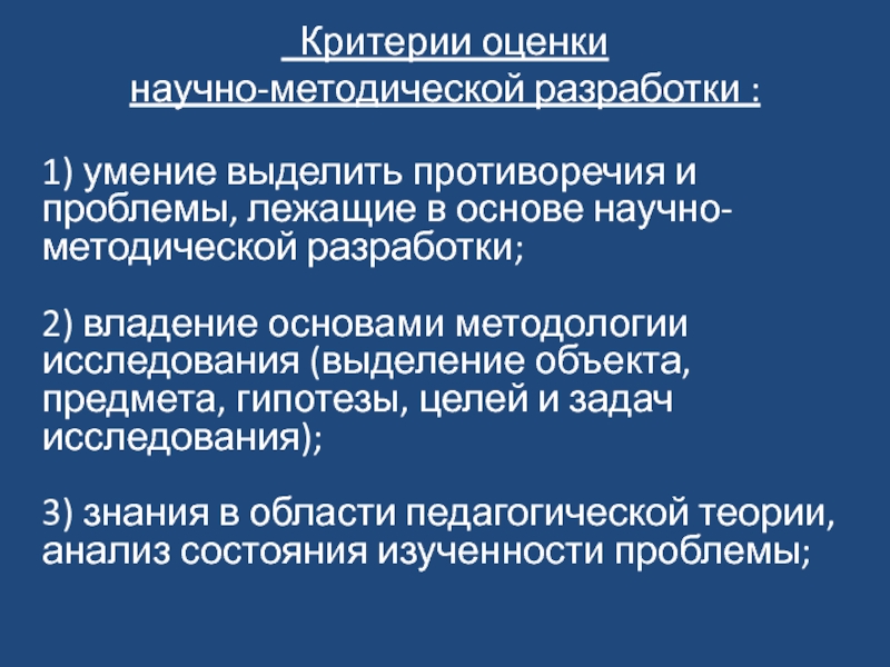 Критерии оценки научно-методической разработки : 1) умение выделить противоречия и проблемы, лежащие в основе научно-методической разработки;