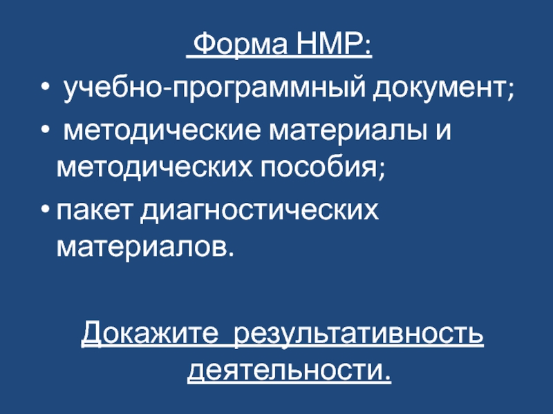 Форма НМР: учебно-программный документ; методические материалы и методических пособия;пакет диагностических материалов. Докажите результативность деятельности.