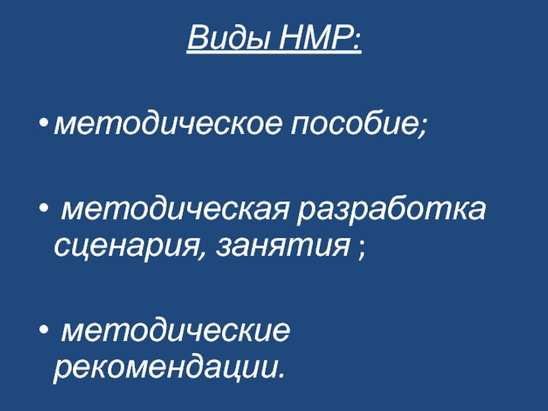 Виды НМР:методическое пособие; методическая разработка сценария, занятия ; методические рекомендации.