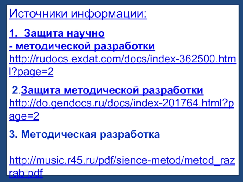 Источники информации:1. Защита научно - методической разработки http://rudocs.exdat.com/docs/index-362500.html?page=2 2.Защита методической разработки http://do.gendocs.ru/docs/index-201764.html?page=2 3. Методическая разработка http://music.r45.ru/pdf/sience-metod/metod_razrab.pdf