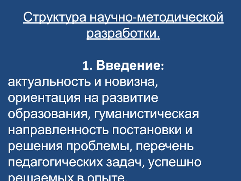 Структура научно-методической разработки. 1. Введение: актуальность и новизна, ориентация на развитие образования, гуманистическая направленность постановки и решения