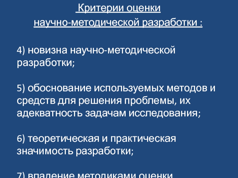 Критерии оценки научно-методической разработки : 4) новизна научно-методической разработки;  5) обоснование используемых методов и средств