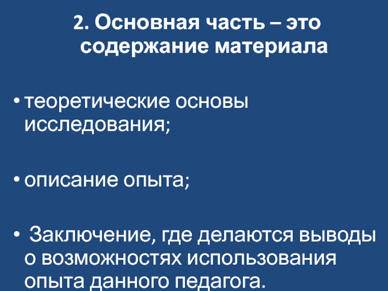 2. Основная часть – это содержание материала теоретические основы исследования;описание опыта;  Заключение, где делаются выводы о