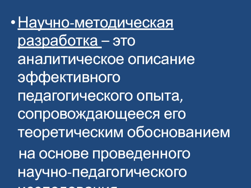 Научно-методическая разработка – это аналитическое описание эффективного педагогического опыта, сопровождающееся его теоретическим обоснованием на основе проведенного научно-педагогического исследования.