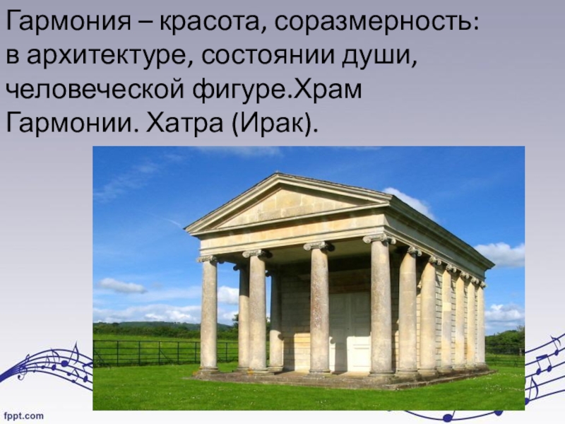 Слайд 3Гармония – красота, соразмерность: в архитектуре, состоянии души, человеческой фигуре.Храм Гармонии.