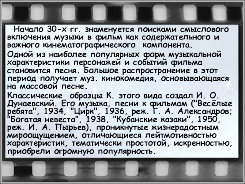 Одной из наиболее популярных форм музыкальной характеристики персонажей и событий фильма становится песня. Большое распространение в этот период получает муз. кинокомедия, основывающаяся на массовой песне.