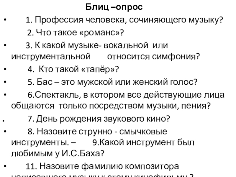 8. Назовите струнно - смычковые инструменты. – 9.Какой инструмент был любимым у И.С.Баха?