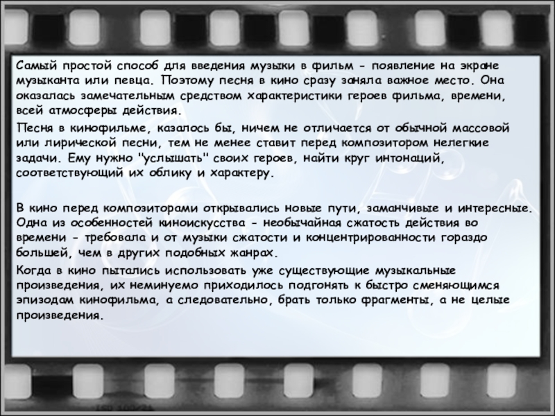 Слайд 11Самый простой способ для введения музыки в фильм - появление на