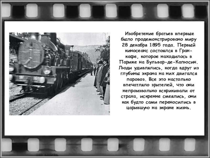 Первый киносеанс состоялся в Гран-кафе, которое находилось в Париже на Бульвар-де-Капюсин. Люди удивлялись, когда вдруг из глубины экрана на них двигался паровоз. Все это настолько впечатляло зрителей, что они непроизвольно вскрикивали от страха, искренне смеялись, они как будто сами переносились в царившую на экране жизнь.