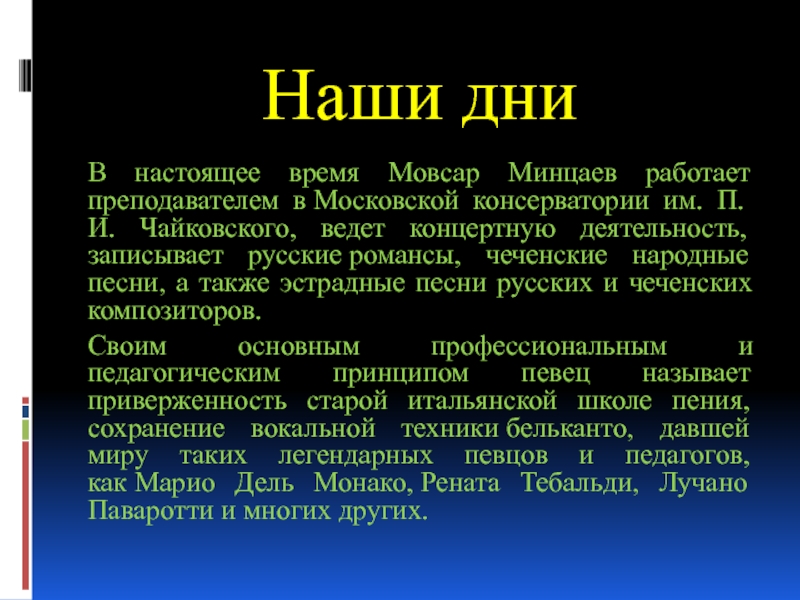 В настоящее время Мовсар Минцаев работает преподавателем в Московской консерватории им.