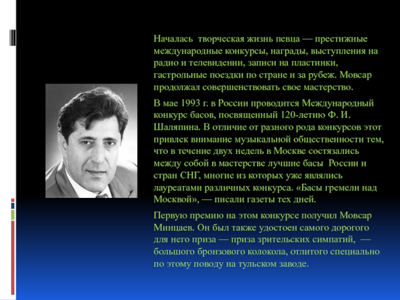 Слайд 11Началась творческая жизнь певца — престижные международные конкурсы, награды, выступления на
