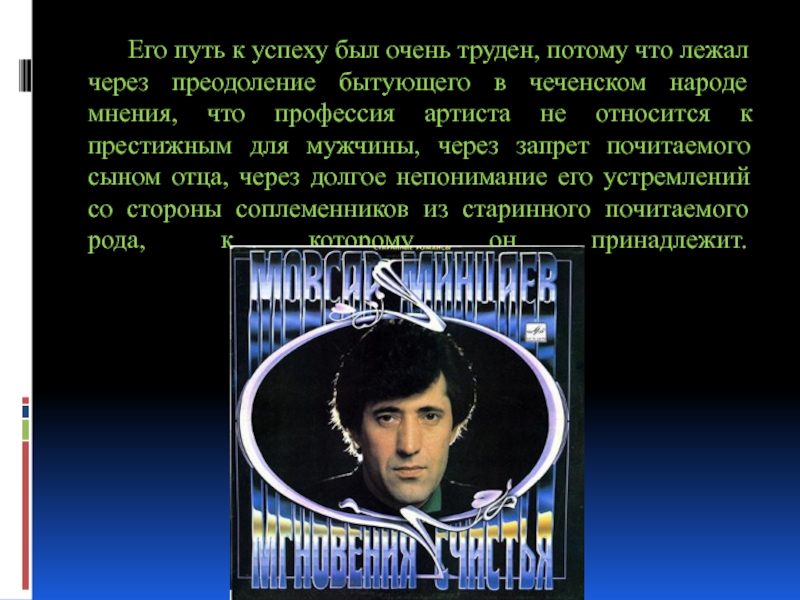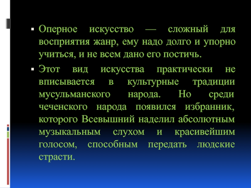 Этот вид искусства практически не вписывается в культурные традиции мусульманского народа. Но среди чеченского народа появился избранник, которого Всевышний наделил абсолютным музыкальным слухом и красивейшим голосом, способным передать людские страсти.