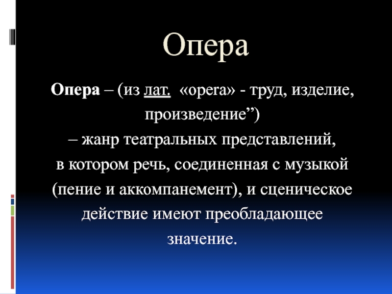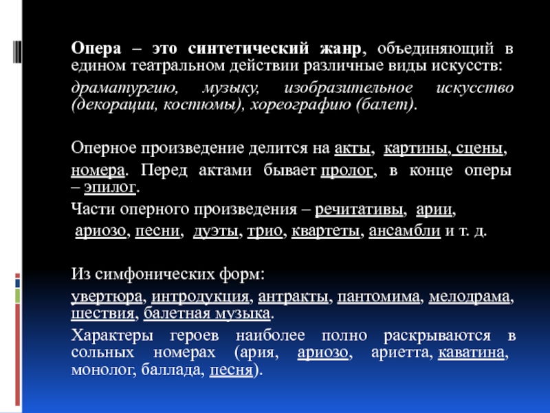 Слайд 5Опера – это синтетический жанр, объединяющий в едином театральном действии различные