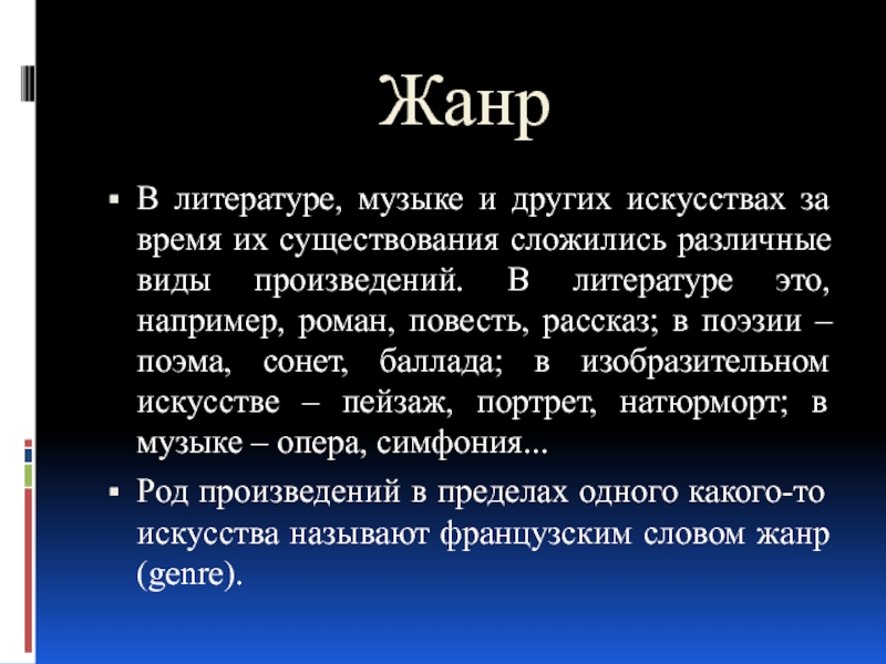 Род произведений в пределах одного какого-то искусства называют французским словом жанр (genre).