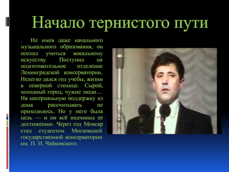 учиться вокальному искусству. Поступил на подготовительное отделение Ленинградской консерватории. Нелегко дался год учебы, жизни в северной столице. Сырой, холодный город, чужие люди… На материальную поддержку из дома рассчитывать не приходилось. Но у него была цель — и он всё подчинил ее достижению. Через год Мовсар стал студентом Московской государственной консерватории им. П. И. Чайковского.