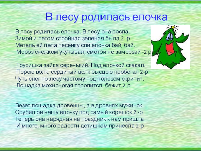 В лесу родилась елочкаВ лесу родилась елочка. В лесу она росла.Зимой и летом стройная зеленая была