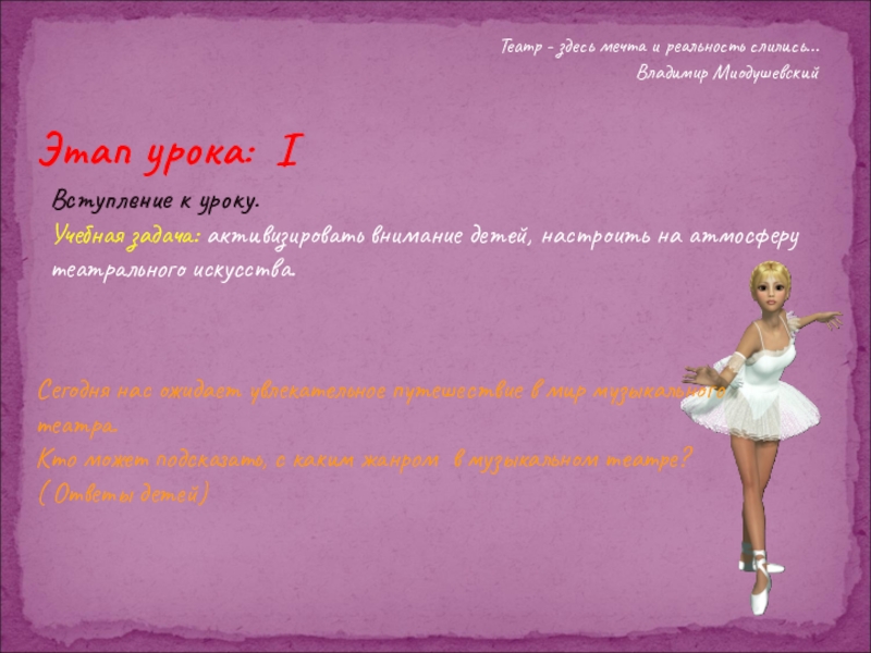 Учебная задача: активизировать внимание детей, настроить на атмосферу театрального искусства.