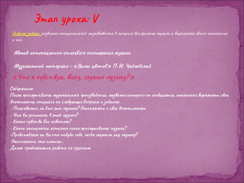 После прослушивания музыкального произведения, название которого не сообщается, школьники выражают свои впечатления, опираясь на следующие вопросы и задания:
