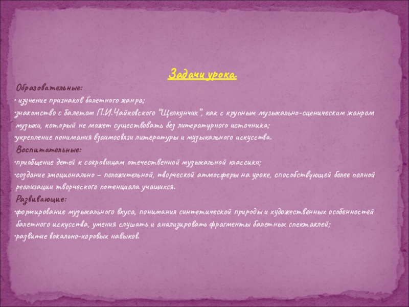Учебная задача - продолжение знакомства с балетом П.И.Чайковского «Щелкунчик»