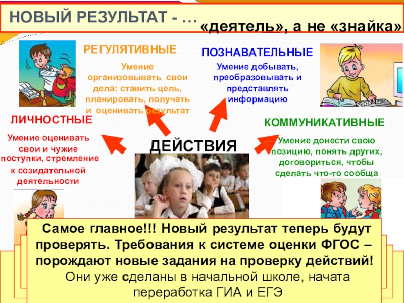 Самое главное!!! Новый результат теперь будут проверять. Требования к системе оценки ФГОС – порождают новые задания на проверку действий!
