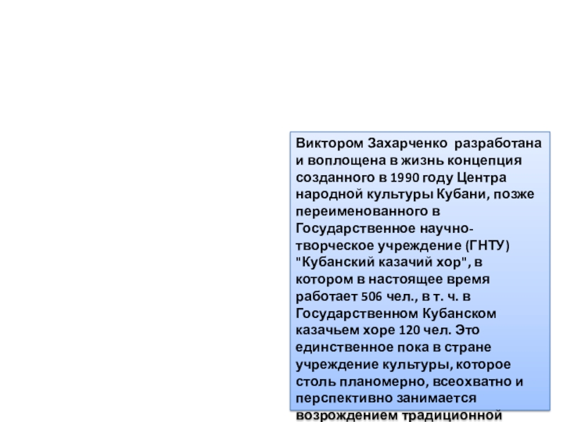 Воссоздание Кубанского казачьего хора в жанре и структуре Государственных русских народных хоров произошло в 1968 г под руководством заслуженного деятеля искусств России Сергея Чернобая.