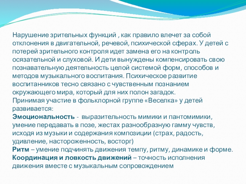 двигательной, речевой, психической сферах. У детей с потерей зрительного контроля идет замена его на контроль осязательной и слуховой. И дети вынуждены компенсировать свою познавательную деятельность целой системой форм, способов и методов музыкального воспитания. Психическое развитие воспитанников тесно связано с чувственным познанием окружающего мира, который для них полон загадок. Принимая участие в фольклорной группе «Веселка» у детей развивается: Эмоциональность - выразительность мимики и пантомимики, умение передавать в позе, жестах разнообразную гамму чувств, исходя из музыки и содержания композиции (страх, радость, удивление, настороженность, восторг) Ритм – умение подчинять движения темпу, ритму, динамике и форме. Координация и ловкость движений – точность исполнения движения вместе с музыкальным сопровождением