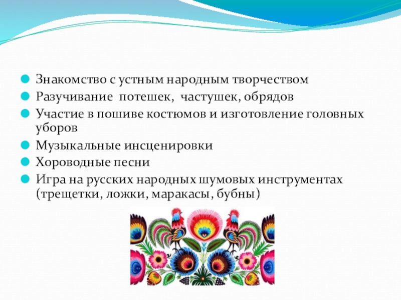 Знакомство с устным народным творчествомРазучивание потешек, частушек, обрядовУчастие в пошиве костюмов и изготовление головных уборовМузыкальные инсценировки Хороводные