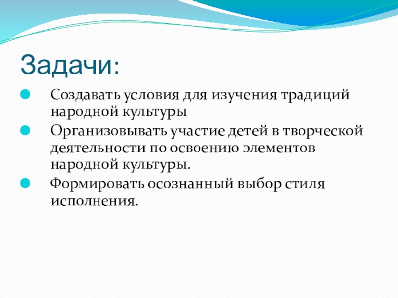 Задачи:Создавать условия для изучения традиций народной культурыОрганизовывать участие детей в творческой деятельности по освоению элементов народной культуры.