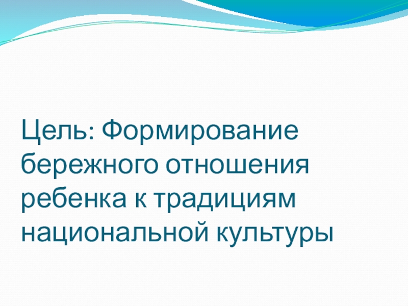 Слайд 4Цель: Формирование бережного отношения ребенка к традициям национальной культуры