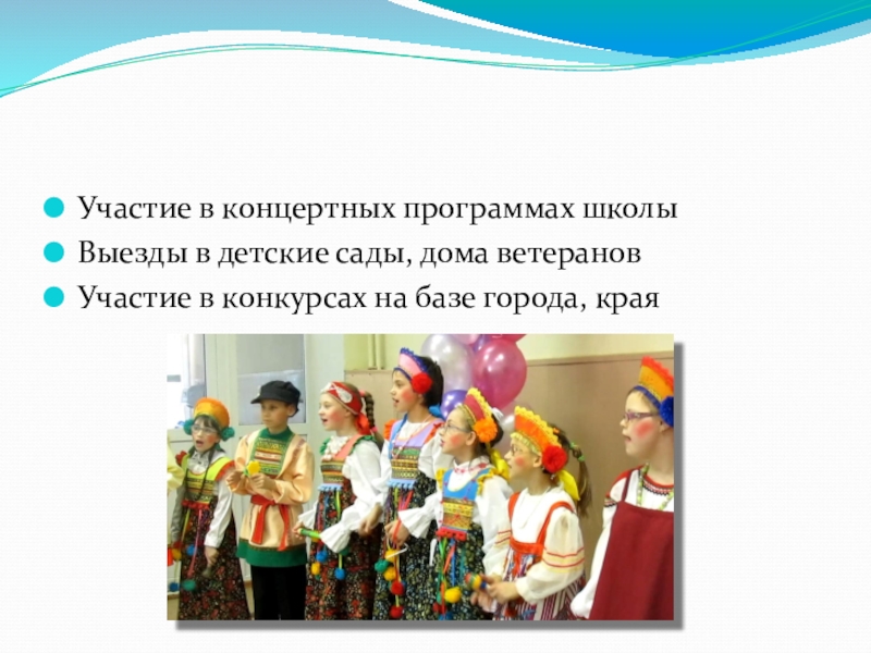 Участие в концертных программах школыВыезды в детские сады, дома ветерановУчастие в конкурсах на базе города, края