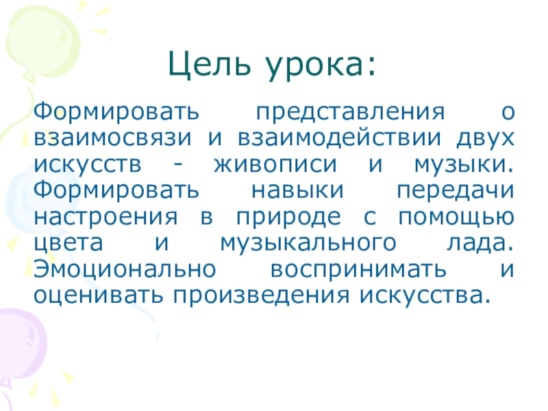 Цель урока:Формировать представления о взаимосвязи и взаимодействии двух искусств - живописи и музыки. Формировать навыки передачи настроения