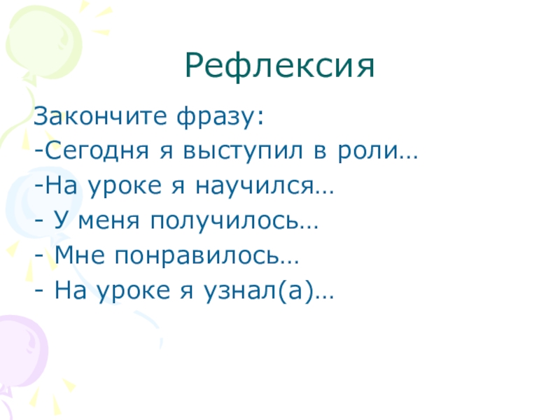РефлексияЗакончите фразу:-Сегодня я выступил в роли…-На уроке я научился…- У меня получилось…- Мне понравилось…- На уроке я