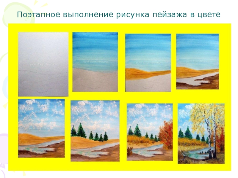 Слайд 15Поэтапное выполнение рисунка пейзажа в цвете