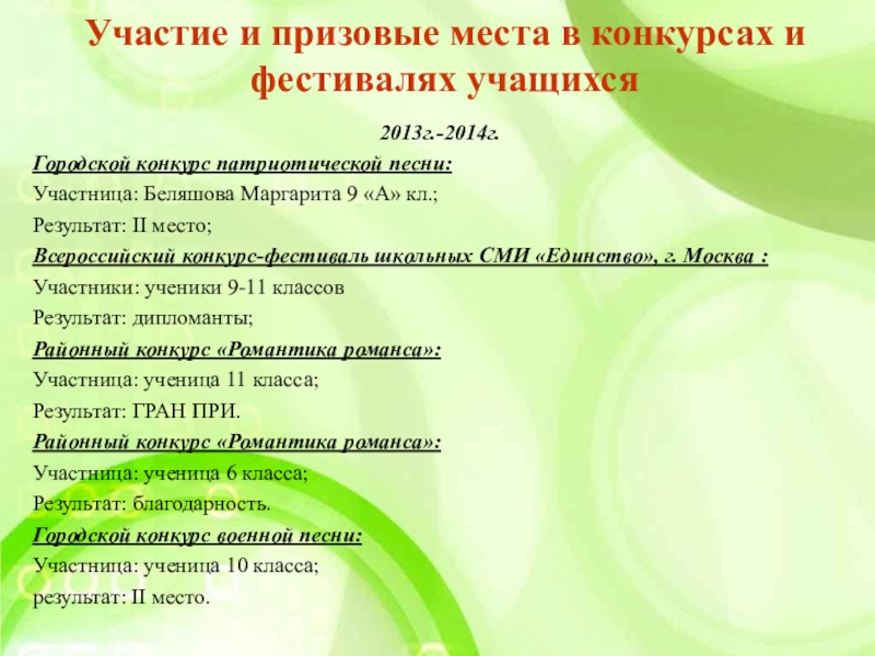 Слайд 6Участие и призовые места в конкурсах и фестивалях учащихся