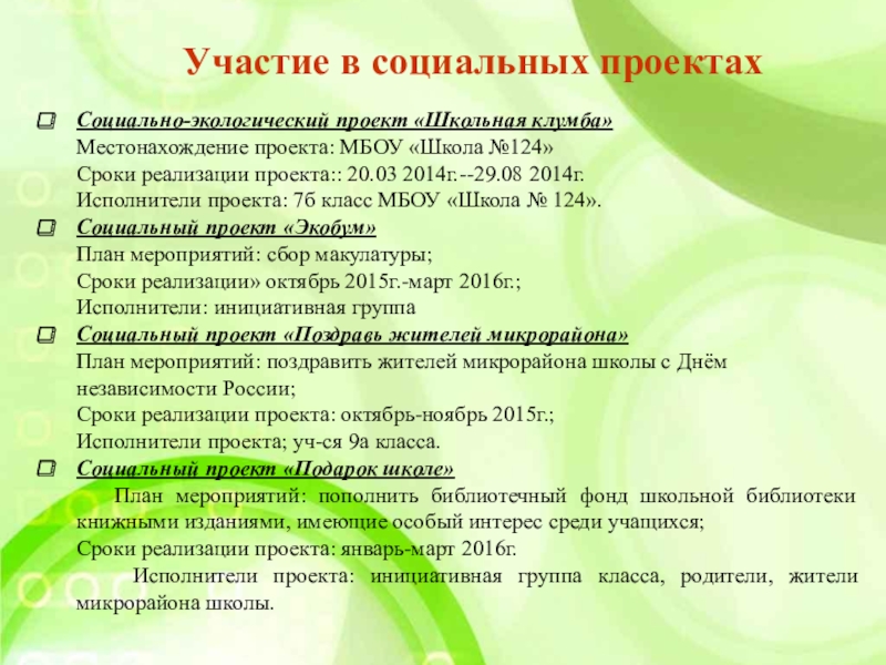 Исполнители проекта: инициативная группа класса, родители, жители микрорайона школы.
