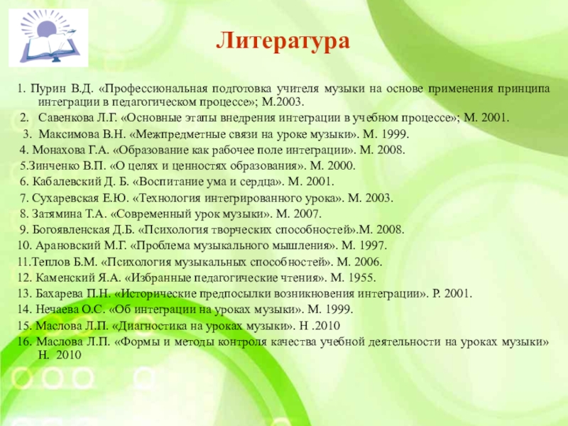 1. Пурин В.Д. «Профессиональная подготовка учителя музыки на основе применения принципа