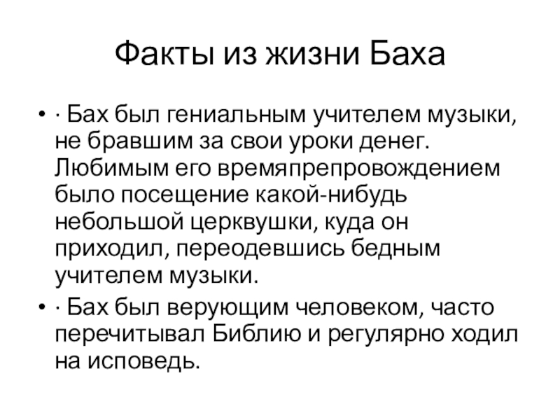 · Бах был верующим человеком, часто перечитывал Библию и регулярно ходил на исповедь.