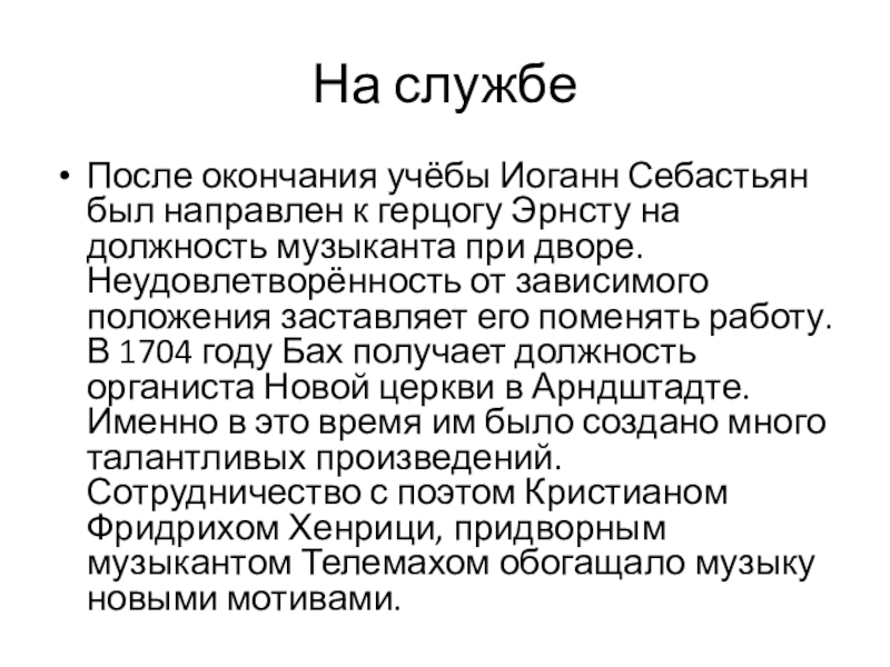 на должность музыканта при дворе. Неудовлетворённость от зависимого положения заставляет его поменять работу. В 1704 году Бах получает должность органиста Новой церкви в Арндштадте. Именно в это время им было создано много талантливых произведений. Сотрудничество с поэтом Кристианом Фридрихом Хенрици, придворным музыкантом Телемахом обогащало музыку новыми мотивами.
