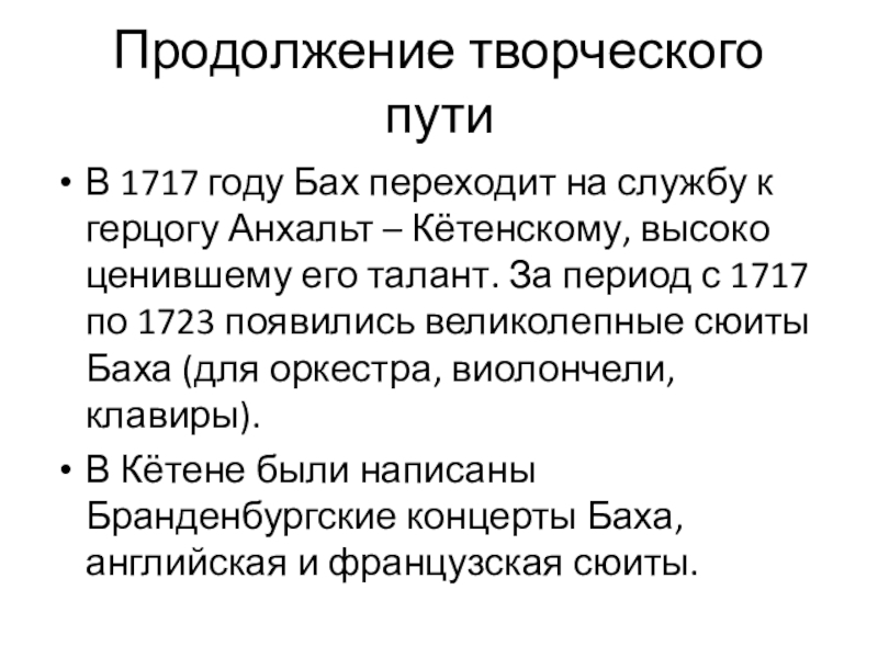 Анхальт – Кётенскому, высоко ценившему его талант. За период с 1717 по 1723 появились великолепные сюиты Баха (для оркестра, виолончели, клавиры).