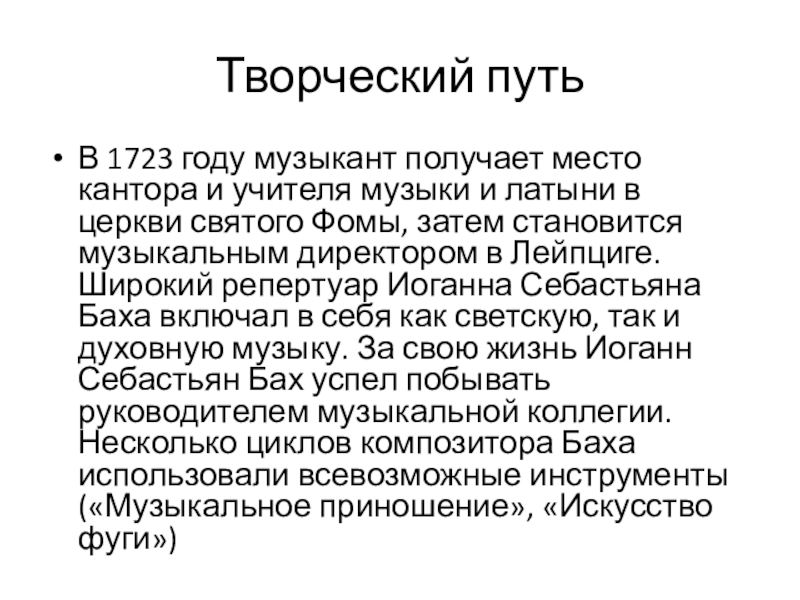 и латыни в церкви святого Фомы, затем становится музыкальным директором в Лейпциге. Широкий репертуар Иоганна Себастьяна Баха включал в себя как светскую, так и духовную музыку. За свою жизнь Иоганн Себастьян Бах успел побывать руководителем музыкальной коллегии. Несколько циклов композитора Баха использовали всевозможные инструменты («Музыкальное приношение», «Искусство фуги»)