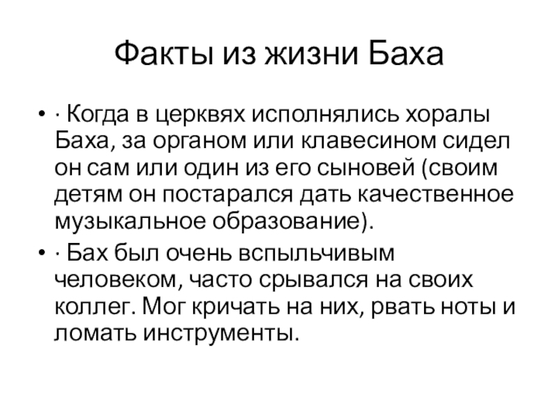 · Бах был очень вспыльчивым человеком, часто срывался на своих коллег. Мог кричать на них, рвать ноты и ломать инструменты.
