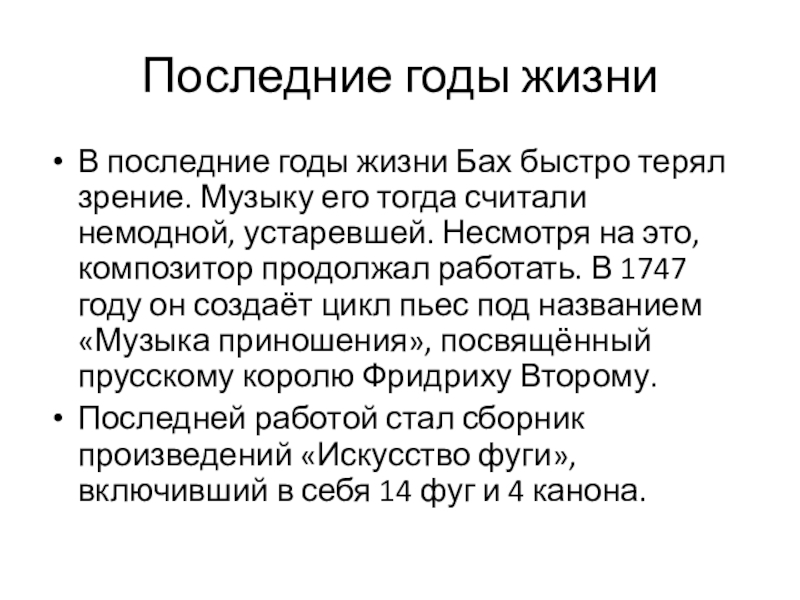 его тогда считали немодной, устаревшей. Несмотря на это, композитор продолжал работать. В 1747 году он создаёт цикл пьес под названием «Музыка приношения», посвящённый прусскому королю Фридриху Второму.