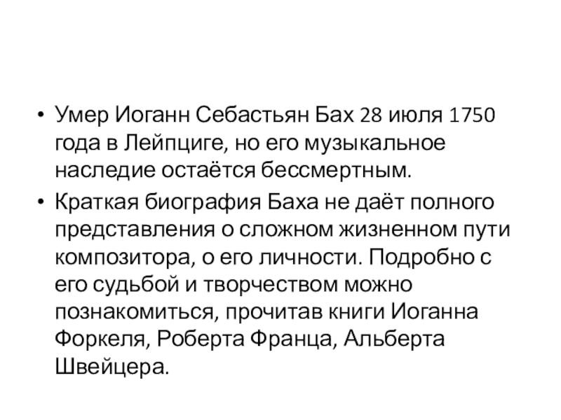 Краткая биография Баха не даёт полного представления о сложном жизненном пути композитора, о его личности. Подробно с его судьбой и творчеством можно познакомиться, прочитав книги Иоганна Форкеля, Роберта Франца, Альберта Швейцера.