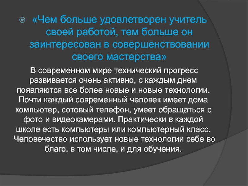 В современном мире технический прогресс развивается очень активно, с каждым днем появляются все более новые и новые технологии. Почти каждый современный человек имеет дома компьютер, сотовый телефон, умеет обращаться с фото и видеокамерами. Практически в каждой школе есть компьютеры или компьютерный класс. Человечество использует новые технологии себе во благо, в том числе, и для обучения.