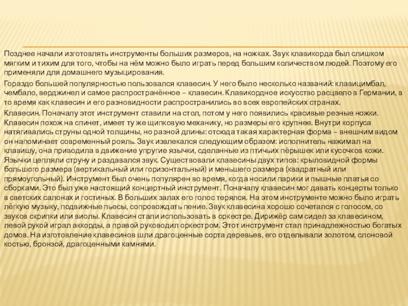 Слайд 18Позднее начали изготовлять инструменты больших размеров, на ножках. Звук клавикорда был
