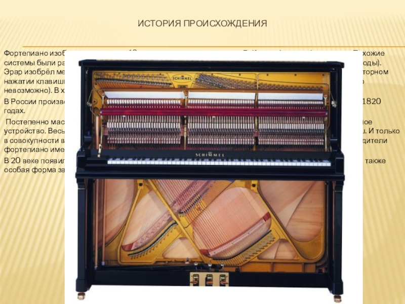 Первые фортепиано были не очень похожи на современные инструменты. В 19 веке у фортепиано постоянно совершенствовался механизм, менялось расположение струн. Мастера придумали педаль, которая при нажатии меняла тембр и силу звука.