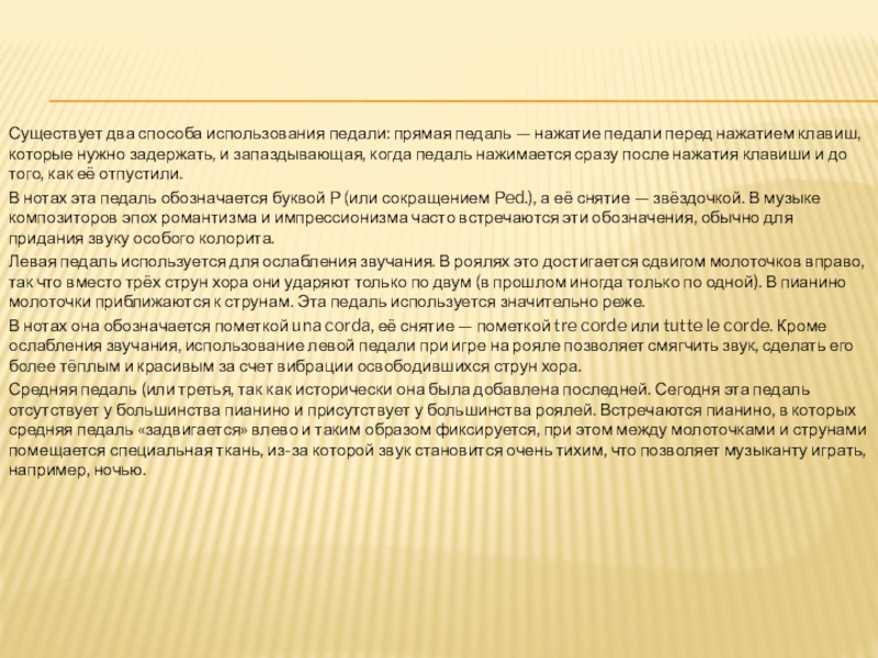 В современных фортепиано присутствует две или три педали. В более ранних инструментах для тех же целей использовались выдвижные рычаги, которые пианист должен был нажимать коленями.